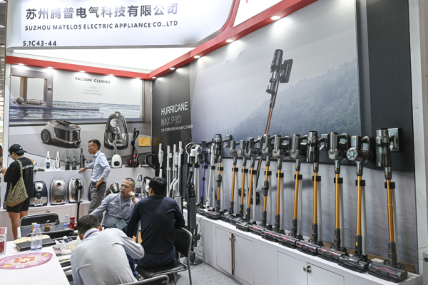 圖為2025年4月15日,在廣州舉行的廣交會上,參展商在銷售吸塵器的展位內等待買家。(Jade Gao/AFP via Getty Images)