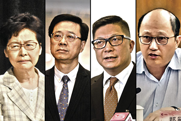 2020年8月7日,美國財政部宣布制裁11名中港官員,包括(從左到右)時任香港特首林鄭月娥、時任香港保安局局長李家超、時任香港警務處長鄧炳強、時任中央駐港國安公署長鄭雁雄。(大紀元製圖)
