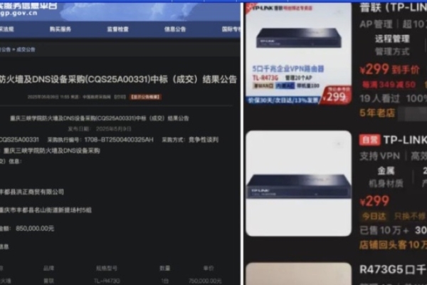 【2025年05月13日訊】(記者張鐘元、李珊珊採訪報導)5月9日,重慶三峽學院採購防火牆及DNS設備採購項目公布,得標價85萬元,其中,主要標的一台品牌為普聯的「出口防火牆」(型號「TL-R473G」),單價75萬元,但中標產品實際市場價僅299元,引質疑。