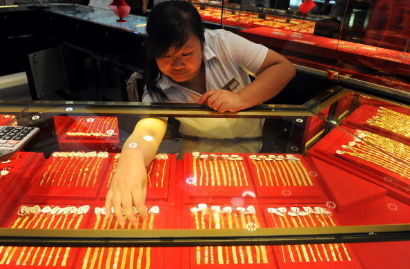 A woman arranges gold jewellery on display at a shop in Hefei, east China's Anhui province on August 23, 2010. China has moved to further free up the nation's gold market by allowing more commercial banks to import and export the precious metal, as rising prices for bullion and tumbling stock markets spur demand. CHINA OUT AFP PHOTO (Photo credit should read STR/AFP/Getty Images)