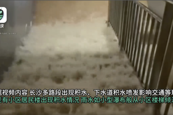 6月7日晚,大量網友在社交平台發暴雨及水淹的視頻。根據視頻內容,長沙多路段出現積水、下水道積水噴發,有小區居民樓出現積水情況,雨水如瀑布般從小區樓梯傾瀉。