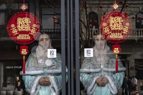 示意圖。圖為2024年2月11日,北京一個歷史悠久的街區,兩名女子站在一家傳統中式高級餐廳門口。(Kevin Frayer/Getty Images)