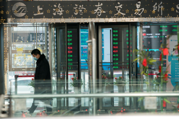 SHANGHAI, CHINA - FEBRUARY 03: A security man wears a mask when standing in front of the front gate of Shanghai Stock Exchange Building on February 03, 2020 in Shanghai, China. (Photo by Yifan Ding/Getty Images)