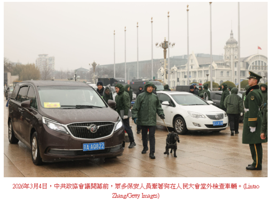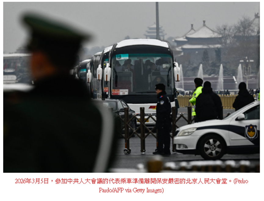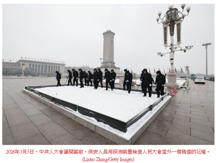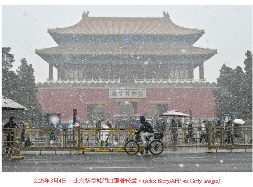 2026年的中共政协、人大会议3月4日、5日开幕,这是每年外界能近距离观察中共政局的一个难得的窗口。今年,参加会议的中共军队代表大幅缩水,会场上的中共军委委员只剩2人,24名政治局委员只有21人现身。两会会场内外保安密集,如临大敌的另类画面透露了中南海的恐惧。忽如其来的降雪更像是上天对中共的又一次警告。