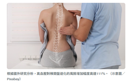 代谢健康对椎间盘的影响可能远超过姿势不良或搬运重物。恒新复健科诊所医师王思恒指出,根据国外大型研究分析,高血压对椎间盘退化的风险增加幅度高达111%,在所有风险因子中影响最为显著,血糖、血脂等代谢指标的影响也比物理性因素来得大。
