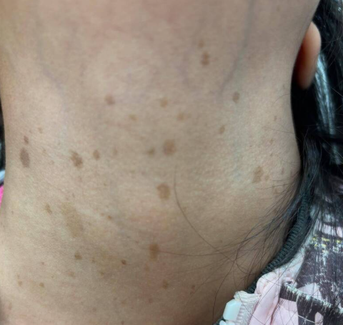 齐育殿说明,这种斑块在医学上叫「咖啡牛奶斑」(Café-au-lait spots),如果身上出现6个以上,一旦青春期前直径>0.5cm,青春期后>1.5cm,就要高度怀疑是不是神经纤维瘤第一型(NF1)。