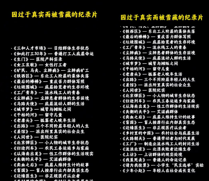 据这份清单显示,相关作品横跨近三十年,涵盖农民工、尘肺病患者、基层执法、流动人口、历史创伤等题材,包括《三和人才市场》《最后的棒棒》《铁西区》《上访》《差馆》《人间世》《请为我投票》纪录片等。多数作品曾在影展或小范围传播,但在中国大陆难以持续公开呈现。