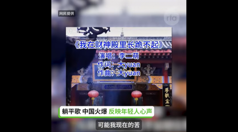 Share Facebook Twitter Email 【中国网路流传“躺平歌”】 【我在财神殿里长跪不起 网路广传】 近来一首新发行的歌曲“#我在财神殿里长跪不起”,在中国网路广为流行。歌词打中人心。叙述年轻人吃苦但收入不高吃泡面,努力无用而“佛系”躺平,上班努力打关系还不如进寺庙许愿,不愿结婚生儿女宁愿买醉。歌曲引发广泛讨论和改编成不同短视频流传。#躺平 #佛系 #财神殿 #彩票店 Post Views: 12,757