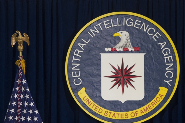 位於弗吉尼亞州蘭利(Langley)的中央情報局(CIA)總部,在美國國旗旁是中央情報局的徽章。(Saul Loeb/AFP)