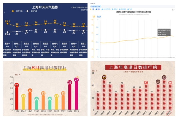 氣象數據顯示,8月徐家匯站的平均氣溫為31.9℃,與2024年並列成為史上最熱8月,期間共出現27個高溫日(其中連續高溫日26天),是高溫日最多的8月。持續晴熱高溫也導致8月降水異常少。今年8月,上海總降水量28.6毫米,為常年平均的九分之一。