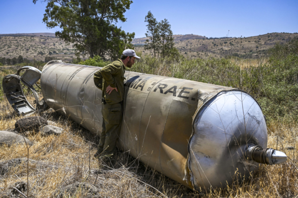 Members of the Israeli security forces check the apparent remains of an Iranian ballistic missile lying on the ground in the Golan Heights, Northern Israel, on Thursday, June 19, 2025. (Photo by Michael Giladi / Middle East Images via AFP) (Photo by MICHAEL GILADI/Middle East Images/AFP via Getty Images)