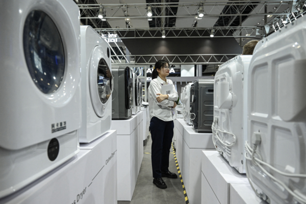 An exhibitor introduces washing machines to buyers at the Canton Fair in Guangzhou, in southern China's Guangdong province on April 15, 2025. Since US President Donald Trump took office in January, China and the United States have been locked in a tit-for-tat tariff war, with the US now charging levies of up to 145 percent on imports from China. (Photo by JADE GAO / AFP) (Photo by JADE GAO/AFP via Getty Images)
