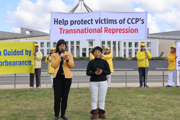 2025年9月2日,來自全澳各地的法輪功學員在澳洲堪培拉國會前的草坪上舉行集會,揭露中共在澳洲持續進行的跨國鎮壓,並呼籲澳洲政府採取行動,制止中共跨國鎮壓行徑。圖為法輪功學員Nancy Dong(右)在集會上。(夏楚君/大紀元)