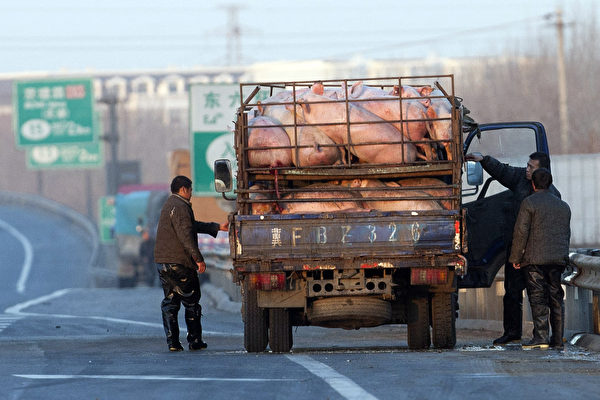中國生豬價格連跌8週,企業陷入深度虧損。圖為北京一輛載著生豬的貨卡停在高速公路邊。(STR/AFP)