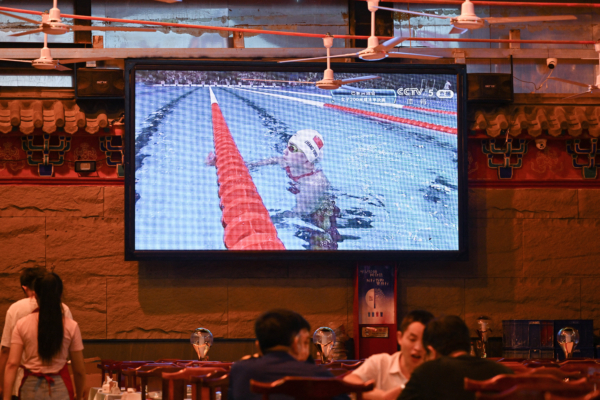 圖為2024年8月1日,北京一家餐廳的電視轉播中國游泳選手張雨菲在巴黎奧運比賽中。(Adek Berry/AFP via Getty Images)
