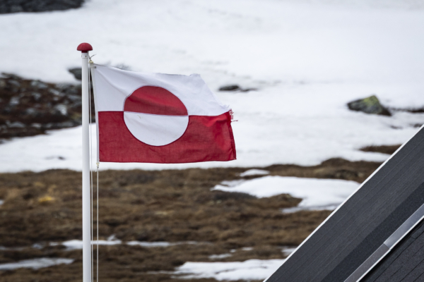 The flag of Greenland blows outside of Nuuk, Greenland, on May 4, 2025. (John Fredricks/The Epoch Times)