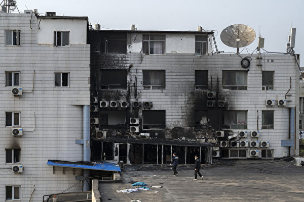 2023年4月19,北京市豐台區長峰醫院火災後,房屋被燒毀場景。(Kevin Frayer/Getty Images)