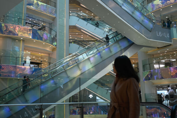 People ride the escalator at a mall in Beijing on February 25, 2025. (Photo by WANG Zhao / AFP) (Photo by WANG ZHAO/AFP via Getty Images)