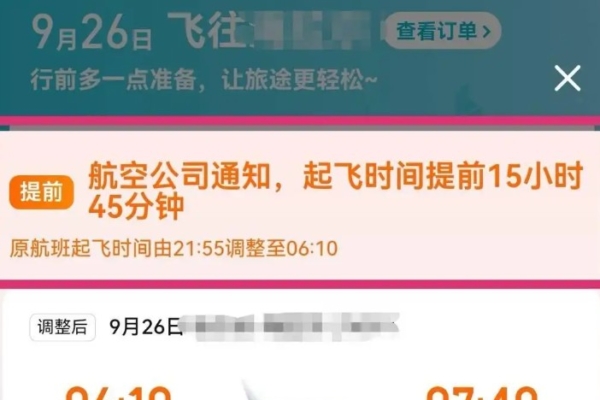 購票平臺信息顯示:「航空公司通知,起飛時間提前15小時45分鐘。原航班起飛時間由21點55分調整至6點10分。」