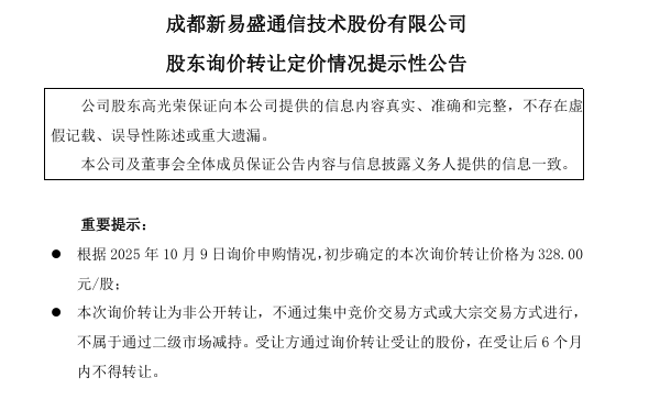 公開信息顯示,截至10月9日收盤,新易盛股價報351.15元/股,總市值為3490億元。按照收盤價來計算,詢價轉讓價格較收盤價折價6.6%。如果按照9月30日收盤價365.77元/股來計算,公司董事長此次套現合計37.49億元;若按收盤價計算,對應市值達41.81億元。