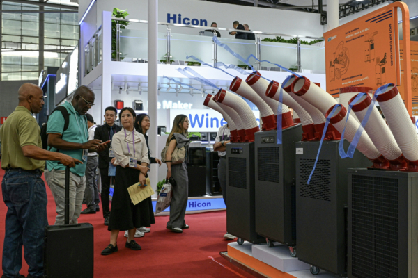 Buyers check out spot air conditioners at the Canton Fair in Guangzhou, in southern China's Guangdong province on April 15, 2025. Since US President Donald Trump took office in January, China and the United States have been locked in a tit-for-tat tariff war, with the US now charging levies of up to 145 percent on imports from China. (Photo by JADE GAO / AFP) (Photo by JADE GAO/AFP via Getty Images)