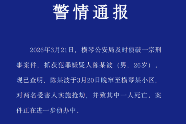 據當橫琴警方3月22日通告,3月21日,橫琴警方抓獲犯罪嫌疑人陳某波(男,26歲)。陳某波於3月20日晚竄至橫琴某小區,對兩名受害人實施搶劫,並致其中一人死亡。
