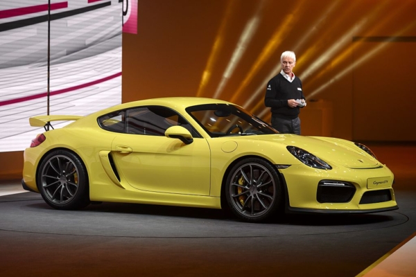 Porsche CEO Matthias Mueller presents the new Porsche Cayman GT4 model car during a preview of German carmaker Volkwagen Group on March 2, 2015 ahead of the Geneva Car Show in Geneva. AFP PHOTO / FABRICE COFFRINI (Photo credit should read FABRICE COFFRINI/AFP via Getty Images)