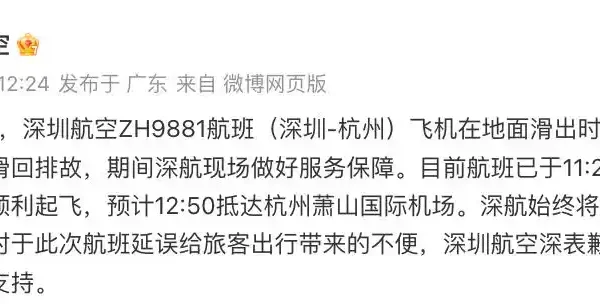 隨後,深圳航空發文稱,ZH9881航班(深圳-杭州)飛機在地面滑出時發生故障。機組按程序滑回排故,深航現場做好服務保障。「目前航班已於11時20分從深圳寶安國際機場順利起飛,預計12時50分抵達杭州蕭山國際機場。」