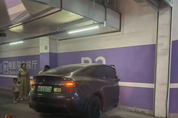 視頻顯示,拍攝時間為8月24日下午近1時,地點不詳。一輛黑色特斯拉進入地下停車場B2層,下坡轉彎時,與對牆擦撞後,車輛隨即向右90度大轉彎,在車速不算高的情況下,徑直撞進前面牆壁,半個車頭沒入牆內。事發地點旁邊墻上,用簡體寫有「有電梯至電影院梯廳」的字樣。