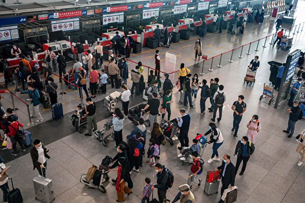 This photo taken on September 30, 2020 shows people queueing up to check in for domestic flights ahead of the country's national "Golden Week" holiday at Beijing's Capital International Airport. (Photo by NICOLAS ASFOURI / AFP) (Photo by NICOLAS ASFOURI/AFP via Getty Images)