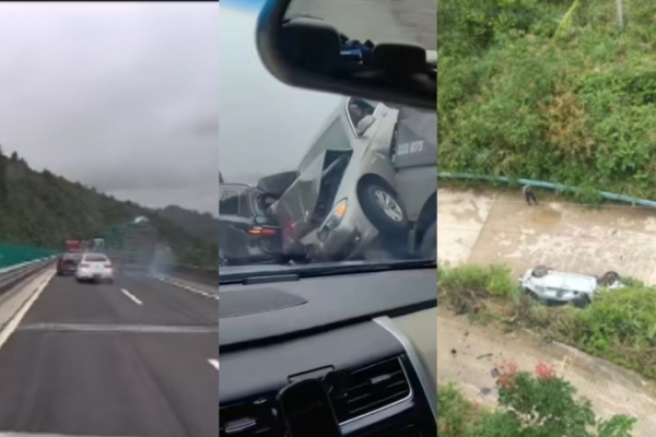 9月26日下午,滬昆高速貴州黔南州貴定縣段二道壩大橋處,發生嚴重追尾事故,造成至少1人死亡、1人受傷。(視頻截圖合成)