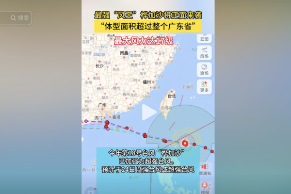 【2025年09月22日訊】超強颱風「樺加沙」將正面襲擊中國廣東省,颱風中心附近最大風力有17級以上,體型面積超過整個廣東省,被稱為最強「風王」。「樺加沙」23-25日將嚴重影響廣東省海面和陸地。廣東多地發預警,屆時可能採取停課、停工、停產、停運、停業措施。