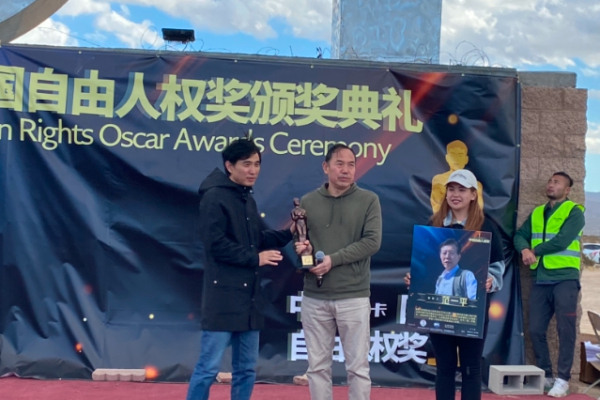 2023年3月12日,吳立新(右一)在好萊塢星光大道出席第10屆奧斯卡中國自由人權獎頒獎典禮,代獲獎者王愛忠領獎。(受訪者提供)