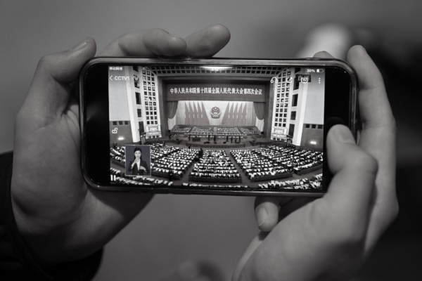 A man watches a live broadcast of the opening session of the National People's Congress (NPC), at a cafe in Beijing on March 5, 2026. (Photo by Pedro PARDO / AFP)