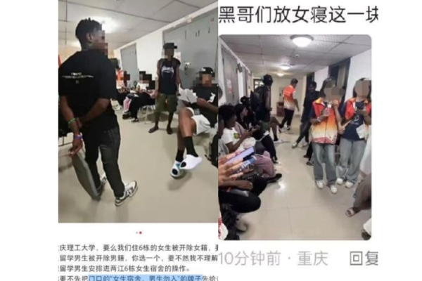 「留學生宿舍還有傢俱?」「天龍人駕到,全體師生跪拜。」「花錢請來的黑大爺們。」「填補了重慶沒有媚黑這一空白。」