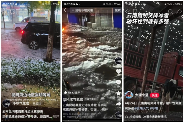 大陸一名科普博主、抖音帳號「環球氣象官」,25日上午發視頻稱,昆明遭遇「史詩級冰雹襲擊」:「24日晚7點左右,昆明周邊地區嵩明等地遭遇強對流冰雹天氣的襲擊,雞蛋大的冰雹密集落下,車窗、門窗被砸得哐哐響。地面瞬間被白色冰雹覆蓋,流動的冰雹像流動的冰河世界一樣,路上的部分汽車躲避不及拋錨。」
