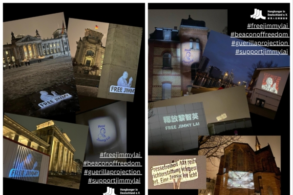 此外,香港人在德國協會(Hongkonger In Deutschland e.V.)還從今年1月份開始,響應一項在美國、英國、澳洲和台灣等各地聲援黎智英的投放影像活動。在黎智英被判決的當天,在柏林德國聯邦議院旁出現了黎智英的影像,旨在引起德國議員關注港府的司法濫用行為。在德國奧芬堡(Offenburg)一家新聞社大樓後方、一座紀念德國《基本法》第五條(保障新聞自由)的紀念碑旁,也出現了黎智英的影像。這些行動旨在提醒德國對保證新聞自由的承諾。