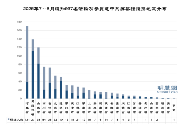 【2025年09月21日訊】(記者李辰採訪報導)據明慧網統計,2025年7-8月獲知,至少937名法輪功學員被中共綁架騷擾。其中,468人被綁架,469人被騷擾,年齡最長者92歲。