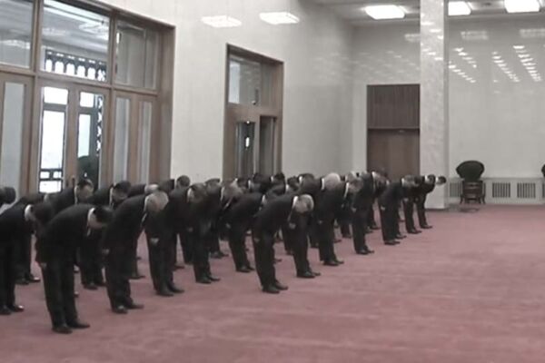 2023年12月26日,中共政治局常委和在京高官向毛澤東紀念館的坐像鞠躬。(視頻截圖)