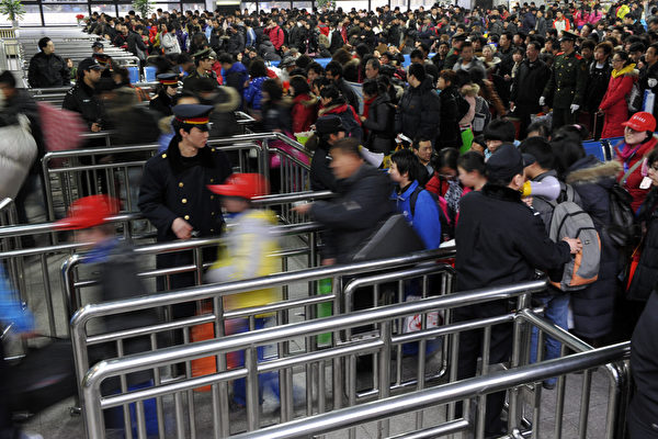 CORRECTING CITY Passengers move through barriers to board a train at the railway station in Beijing on February 6, 2010, taking the journey home for the Lunar New Year. About 240 million people are expected to crowd China's trains and planes for the holiday, according to government estimates, as Chinese traditionally return to their home towns and villages for family reunions for the Lunar New Year which falls on February 14. CHINA OUT AFP PHOTO (Photo credit should read AFP/AFP/Getty Images)