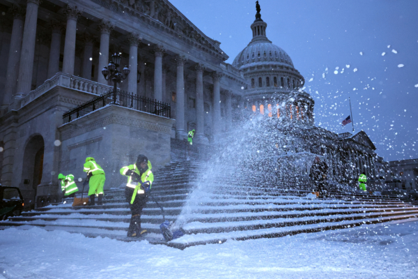 WASHINGTON, DC - JANUARY 06: Crews work before dawn to clear snow from the steps on the East Front of the U.S. Capitol as a winter storm slams into the nation's capital on January 06, 2025 in Washington, DC. Congress is scheduled to certify the 2024 presidential elections results on Monday, four years after a mob of supporters of then-President Donald Trump stormed the capitol to halt the certification of the 2020 election results. (Photo by Chip Somodevilla/Getty Images)