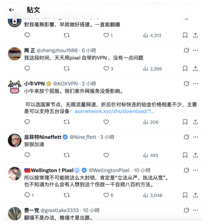 中共官方行动显然令民间翻墙难度大幅增加,地下VPN产业受创。不过,有不少网民翻墙到海外X上留言表示,中共这套白费功夫。