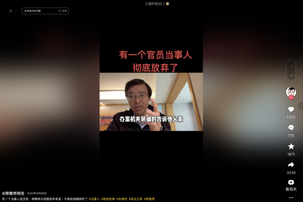 【2025年01月02日訊】(記者李淨報導)大陸刑法專家蔡雅奇律師近日披露,他代理案件的當事人是一名了解中共官場規則的官員,因犯罪被當局留置(羈押)。該官員雖然表示此案為冤案,卻突然放棄請律師,其家屬向代理律師披露了其中的內情。