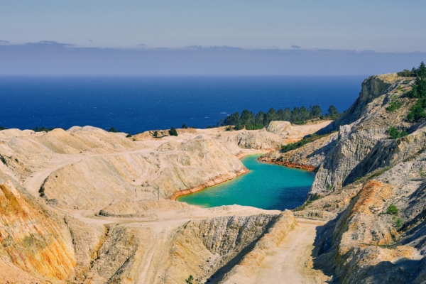 Tungsten mine with turquoise blue water, on Mount Neme in A Coruña, Galicia. With the atlantic ocean in the background.