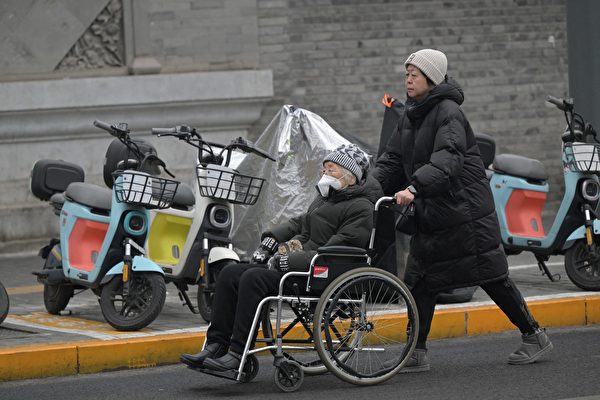 中共2025年1月17日公布的數據顯示,中國人口連續三年下降。圖為2024年1月17日,一名婦女在北京街頭推著一名坐在輪椅上的男子。 (Pedro Pardo/AFP via Getty Images)