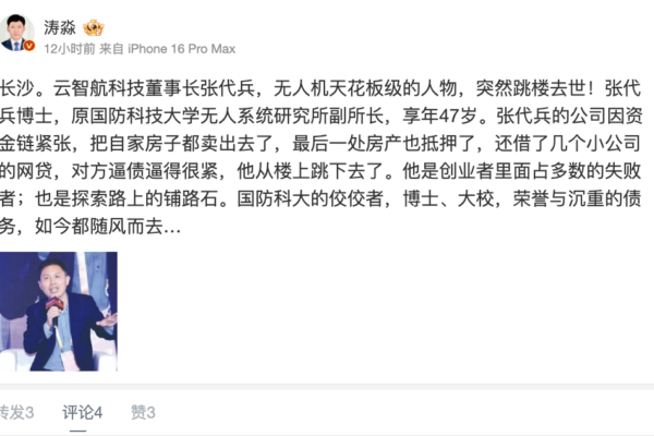 【2025年01月04日訊】(記者寧海鐘綜合報導)中國無人機專家,被稱為「無人機天花板」的雲智航公司創始人張代兵,1月3日凌晨死亡。知情者披露,47歲的張代兵因創業欠下巨額債務,跳樓身亡。