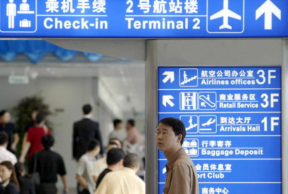 BEIJING, CHINA: Chinese airline passengers find their way around the newly reopened terminal of Beijing's Capital International Airport, 20 September 2004 after a 14-month renovation to relieve mounting air traffic pressure. The four-storey Terminal One will be exclusively used by China Southern, the country's largest carrier, mostly for domestic air routes, as with an annual capacity of nine million passengers, it will ease pressure on Terminal Two which has already topped its annual designed capacity of 27.5 million passengers. AFP PHOTO (Photo credit should read STR/AFP/Getty Images)