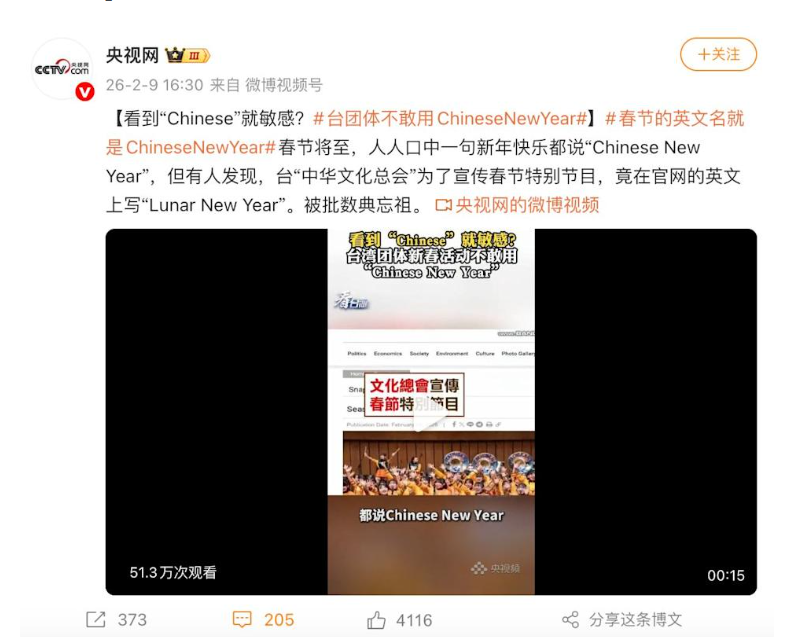 中国官媒《央视》9日下午发文怒轰「台团体不敢用Chinese New Year」,内文指出,春节将至人人口中新年快乐都说「Chinese New Year」,怒批台湾中华文化总会在宣传春节特别节目时,在官网的英文上写的是「Lunar New Year」,《央视》怒轰是数典忘祖,强调「春节英文名字就是Chinese New Year」。
