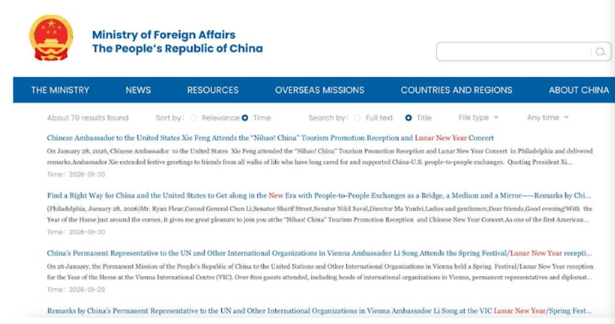 然而也有人质疑「意思就是农历新年,有啥问题吗」,就有网友抓包,实际搜寻中国外交部官网的英文网页,可以发现中共自己的英文新闻稿中用的也是「Lunar New Year」,一直到今年1月30日的新闻稿都可以看到「Lunar New Year」,且还是在新闻稿的正式标题上。
