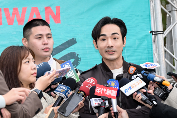 台灣網紅八炯(右一)與陳柏源(右二)自製中國統戰紀錄片,揭露中共如何收買台灣網紅的手法。圖為八炯接受媒體聯訪。(宋碧龍/大紀元)